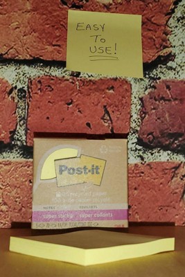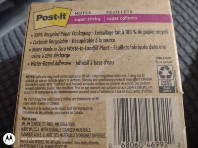 Post-it 100% Recycled Paper Super Sticky Notes are made from 100% recycled paper and feature two times the sticking power to make sure your message stays put. Succeed in your everyday tasks and feel good knowing these notes are made in a zero-waste-to-landfill plant. Packaging is also made from 100% recycled paper. Post-it Notes Super Sticky 100% Recycled Paper Super Sticky Notes, 3" x 3", Canary Yellow, 70 Sheets/Pad.