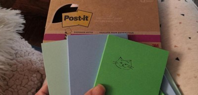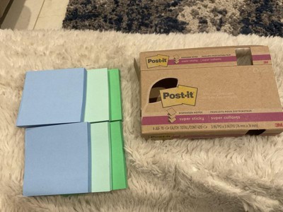 [This review was collected as part of a promotion.] I really liked these Post-it® 100% Recycled Paper Super Sticky Dispenser Notes, Oasis Collection, 3 in x 3 in, 6 Pads, 70 Sheets/Pad. They are very sticky and stay stuck for awhile. I use these daily to keep little reminders around the shop for my team.