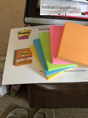 [This review was collected as part of a promotion.] I volunteer to evaluate 3M product and the company sent me a free sample of super sticky Post it Notes. They are two times more sticky power and I got five colors, Orange, Pink, Green, Blue and Yellow and they are 90 each. Every color is 3 by 3 inches. I use them for work or while going to college and the kids take some to school. My husband leaves notes around the house and on his computer desk for reminders. They sick really well on surfaces. The vibrant colors help me organize my task better. Love them! Great for all ages. Writes on with ink, marker or pencil.