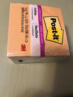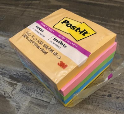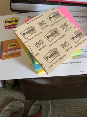 Post-it® Super Sticky Notes, 3 in x 3 in, Energy Boost Collection, 5 Pads/Pack | Post-it® Super Sticky Notes in 3 in x 3 in feature 2x the sticking power. Use for notes or reminders on doors, windows or walls. Unique adhesive reliably sticks and re sticks so your message can stay front and center. Move your notes with you throughout the day. Vibrant, spirited colors brighten your mood and messages in the Energy Boost collection. Post-it® Super Sticky Notes are recyclable and the paper in Post-it® Super Sticky Notes is sourced from certified, renewable and responsibly managed forests. 5 Pads/Pack, 90 Sheets/Pad.