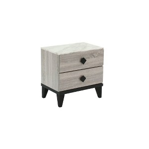 Designed to combine practicality and modern elegance, this versatile piece is compact yet spacious enough to keep your essentials within arm’s reach. The sleek faux marble surface adds a touch of opulence to your space. Its smooth finish is not only visually appealing but also makes it perfect for holding a lamp, books, or your morning cup of coffee. Organize your bedside essentials effortlessly with two spacious drawers. Each drawer is accented with a diamond shaped knob, adding a hint of sophistication to the design. The tapered legs provide a sturdy foundation while enhancing the nightstand’s clean and contemporary look.