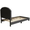 - Panel bed design offers arched shape with nail-head trim and button tufted accents