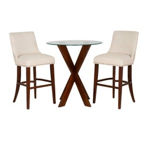 Bring refined charm and functional style to your home with the Powell Axbridge 3-Piece Pub Dining Set in Espresso and Natural. Designed to make a bold statement in compact spaces, this elevated tavern-style set includes a pub height table and two comfortably cushioned stools with supportive backs. The table is masterfully crafted from solid acacia wood, stained in a deep espresso brown for a rich, timeless finish. Topped with a beveled tempered glass surface, it delivers a perfect blend of durability and modern sophistication—ideal for daily meals, cozy coffee chats, or hosting in style.