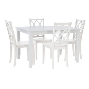 Create a dining experience that feels both elevated and inviting with the Powell Shelby 5-Piece Rectangle Dining Set in White. This versatile set pairs a crisp white rectangular table with four white-finished chairs, delivering a stunning contrast that enhances any space—from airy breakfast nooks to cozy kitchen corners and open dining rooms. The timeless lattice-back design brings classic farmhouse character while keeping things light and contemporary, making this set a seamless addition to both traditional and modern interiors. Whether you're hosting casual weeknight dinners or festive weekend gatherings, this set offers a stylish foundation for every meal and memory.