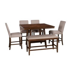 Perfect for everything from weeknight dinners to festive gatherings, this six-piece dining set blends classic charm with smart, space-saving functionality. The elevated counter height adds a contemporary edge while encouraging relaxed, informal dining. Rich brown tones and soft, neutral upholstery make this set a seamless fit for both rustic and modern interiors. Whether you're hosting a casual brunch or enjoying a cozy dinner with family, the Powell Barnes Dining Set helps you dine in comfort and style—every single day. Powell Company is dedicated to offering high-quality, stylish furniture that enhances the beauty and functionality of your home, making it a place of comfort and elegance.