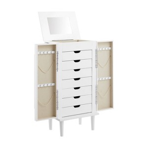 Elevate your jewelry collection with the Jenn White Jewelry Armoire, where style meets functionality in an elegant design. The flip-top vanity mirror offers a practical touch, allowing you to effortlessly try on pieces and perfect your look before heading out the door. When it’s time to organize, the armoire's expandable side panels reveal 20 hooks—10 on each side—ideal for neatly hanging your chains and bracelets. The versatile center doors, with 16 additional hooks, keep your accessories visible and accessible, making it easy to find the perfect piece for any occasion.
