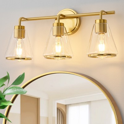POWLIG 22" Gold Vanity Light Fixture - 3-Light Dimmable Bathroom Lighting with Cone Clear Glass Shades, Modern Farmhouse