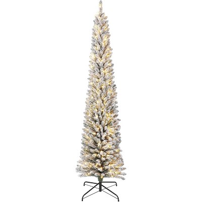 6FT Pre-Lit Artificial Christmas Tree, Snow Flocked Pencil Christmas Tree with Metal Stand, Slim Xmas Tree for Home Office Party Holiday Decoration