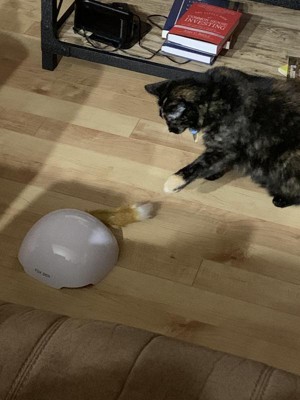 [This review was collected as part of a promotion.] I like the idea of this toy, but it needs some changes. This makes a loud noise every time the tail moves, which terrifies my cats. After several minutes they relaxed and started playing. Two of the cats caught the tail with their claws and their paws were sucked into the hole when they didn’t let go. This scared them and they drug the toy until they could release their claws and get free. I am concerned by that and would prefer a toy where the tail didn’t suck back inside. Other than that, it’s easy to turn on and the outside is made of sturdy plastic.