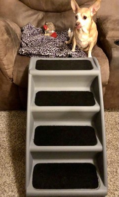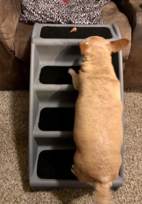 [This review was collected as part of a promotion.] These steps are awesome for my fur baby! I love that it was super easy to set up and use. I think the best part is that it folds up so you can easily store it when not needed. I did get this for my Chihuahua as she has a hard time getting up on the couches and bed because they are too high and she needs a lot of space to do it (that's why I choose a little bit bigger of a step) - it took a bit to coax her to get on them but once she realized it was there to help her she totally digs it and uses it regularly. This is very sturdy and has the felt padding for non slipping. Overall my pup gives this 5 stars!