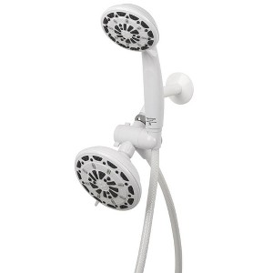 The Waxman Serene 6-Spray Premium Combination Shower Head in White features a large 5" fixed head and a 4" handheld head for extra water coverage. The 3-way diverter allows you to run the shower heads together, or separately, for a customized experience. The handheld shower head comes with a 60" metal hose for reach and accessibility. No tools are required for installation and comes backed by a limited lifetime warranty.