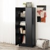Turn any cluttered room into an organized space with the Prepac Elite Storage Cabinet. This 16" deep storage cabinet offers 34% more storage space than standard storage cabinets for convenient, versatile storage that helps you maximize the space in your garage, laundry room, kitchen, bathroom, office, or workshop. Practical and efficient, the fixed shelf provides reliable stability for any items that need a dedicated spot while the 2 adjustable shelves provide the flexibility to accommodate a variety of items with varying sizes to ensure each inch of space is utilized effectively. This deep storage cabinet is as functional as it is stylish with its clean lines and soft-edge doors on adjustable 6-way European-style hinges all in a sleek black laminate finish with elegant brushed metal handles. Constructed from non-toxic, CARB-2 compliant, laminated composite woods with a sturdy MDF back panel, this high-quality storage cabinet provides long-lasting durability to withstand years of quality organization. The storage cabinet measures 24" W x 65" H x 16" D with each shelf holding up to 20 pounds, and it ships ready-to-assemble with an instructional booklet for quick and easy assembly.
