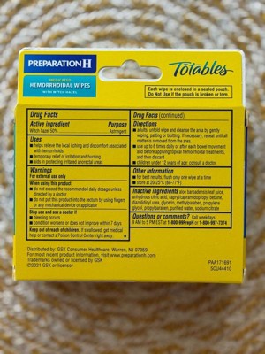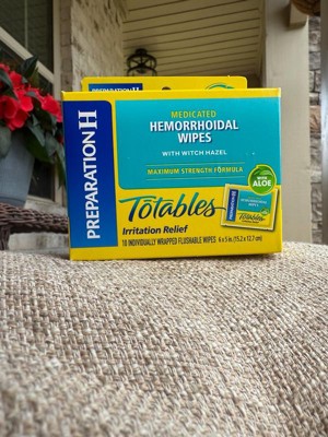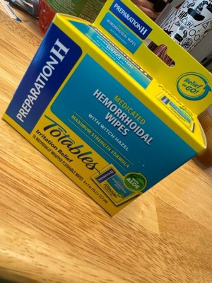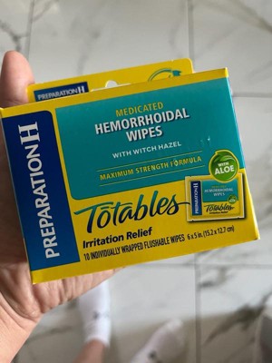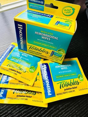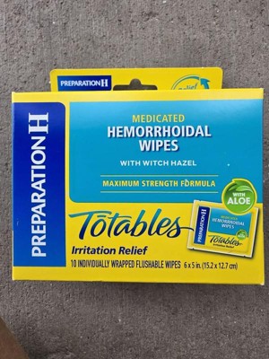 Preparation H Hemorrhoid Wipes with Witch Hazel offer soothing, cleansing relief of irritation caused by hemorrhoids. Even mild irritation around the butt can be an uncomfortable and persistent problem. When other hemorrhoid treatments aren't providing the comfort you need, these flushable, septic-safe wipes combine the relief you trust from Preparation H hemorrhoid care products with soothing aloe and cleansing witch hazel for gentle daily hemorrhoid care. These itch relief wipes also help relieve itching associated with hemorrhoids. Apply these Preparation H wipes 3-4 times daily for fast acting hemorrhoid care. Get comfortable with it, with hemorrhoid relief from Preparation H, the number 1 doctor recommended brand for hemorrhoid treatment (1).