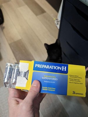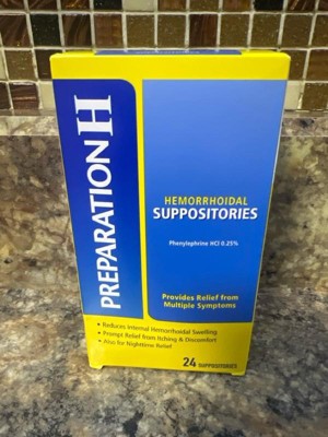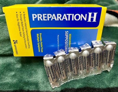 Preparation H Hemorrhoid Suppositories offer multi-symptom pain relief caused by hemorrhoids. Even mild irritation around the butt can be an uncomfortable and persistent problem. When other hemorrhoid treatments aren't providing the comfort you need, these hemorrhoidal suppositories combine the relief you trust from Preparation H hemorrhoid care products to relieve discomfort. Preparation H hemorrhoid treatment cream helps relieve internal pain, itching and burning so you can get comfortable. Preparation H suppositories reduce swollen tissue caused by internal hemorrhoids while helping prevent further irritation. Insert these suppositories up to 4 times daily, especially at night, for fast acting hemorrhoid care. Get comfortable with it, with hemorrhoid relief from Preparation H, the number 1 doctor recommended brand for hemorrhoid treatment (1).