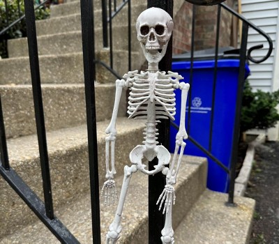 The skeletons are hanging along the stair well. The kids are going to get a spooky treat as they come up for their candies. Haha, I wonder how their faces going to be like.