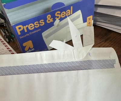 Q: If I hold this upc 9810165398 up and up press and seal 4 in x 9 1/2 inch security envelope up to the light, I can see and read everything put in it! Do you think I might have a defective batch?