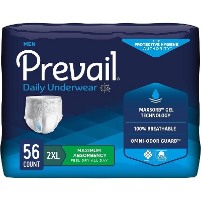 Every Prevail protective undergarment is designed for four things: comfort, absorbency, skin health, and discretion. Prevail for Men underwear is specifically designed for men who need moderate to heavy leakage protection, keeping you 5X drier than the leading brand. Only Prevail has MaxSorb Gel technology which quickly locks up wetness to help keep you feeling cleaner, fresher, and drier. Additional features include: Omni-Odor Guard a dual action system to help prevent odors before they begin , 360° Breathable Zones keep you cool and comfortable by allowing air to circulate around the entire underwear and help prevent heat and moisture build up, Dri-Fit cotton enhanced system to help keep skin dry and healthy by reducing friction, Comfort-Shape Plus with gentle elastics that shape to your body for a more natural fit.