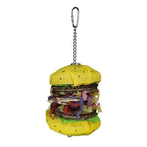 Playfuls Patty Stack #60269 Bird Toy from Prevue Pet Products is a versatile and engaging toy designed for small to medium-sized birds, such as parakeet and cockatiel. This toy is meant to provide both physical and mental stimulation to keep your bird entertained and active. It offers various elements such as moving parts, balancing challenges, manipulative components, and materials for chewing. Engaging with these different aspects of the toy can contribute to your bird's overall well-being, both physically and mentally. Patty Stack is whimsically shaped like a hamburger and includes a variety of materials including corrugated cardboard, raffia sheets and colorful paper strips. The toy slides and rotates on the chain. Measures approximately 4" long by 3 1/2" wide by 9 1/2" high. Since the toys are handmade, there might be slight variations in shape and size. Regularly inspect the toy for any signs of wear or damage, and replace it when it's used or worn out to ensure your bird's safety and continued enjoyment.