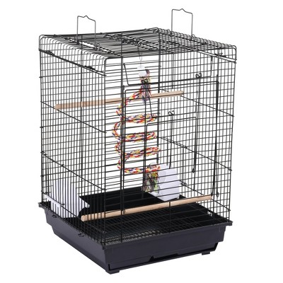 Prevue Pet Products powder-coated steel construction 3151BLK in Black Hammertone offers quality craftsmanship at an affordable cost. Powder-coated steel construction with a cagetop playstand to keep your bird entertained and content, the heavy-duty push button lock keeps your bird securely inside its cage when playtime is over. This select bird cage also includes four stainless steel cups, two wood perches and a caster stand for portability. Both trays and bottom grille are removable for ease of cleaning while the rounded corner seed guards control mess around the cage. Our powder-coated steel construction Cage in Black Hammertone measures 18" long, 18" wide, 57" high with 3/4" wire spacing.