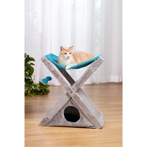 Prevue Pet Products X-tra Fun Kitty Center Blue 7337 is an easy-to-assemble activity center for your kitten or cat. The single-piece construction opens easily or folds closed for quick storage. The side panel has a sisal scratching surface, the bottom features a cozy hideaway and the top has a plush hammock-style bed. Two plush dangle toys keep your kitty engaged and playful. Many cat-friendly features are found in this fun activity center. The dove gray plush is highlighted with a beautiful turquoise blue and blends well with any décor. Measures 22 1/2" long, 14 1/2" wide and 25" high. Hideaway opening measure 6 1/4" in diameter.