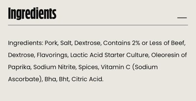 pork, salt, contains 2% or less of beef, dextrose, flavorings, lactic acid starter culture, oleoresin of paprika, sodium nitrite, spices, vitamin c (sodium ascorbate), bha, bht, citric acid.