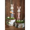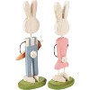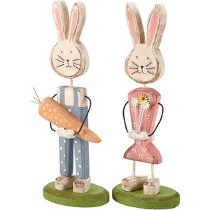 A set of two wooden sitters displaying delightful bunny designs on grass-green wooden bases. Designs include a bunny wearing polka dot overalls and holding a large carrot as well as a bunny wearing a flower dress and holding spring flowers. Bunnies are recreated from an original hand-carved and painted piece with distressed details. Sitters feature wire and painted accents to create a handmade feel. Our Bunny Couple stand-up set is designed to free-stand alone on a flat surface. A set of fun seasonal home accents that adds character to any display.