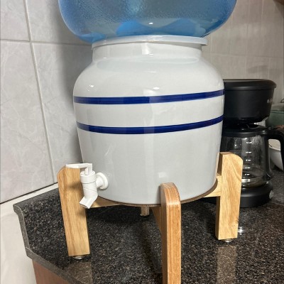 Q: What is the base made of? Wood? And the dispenser, ceramic? Does the water filter throuhg the ceramic if that is the case and purify the bottled water?
