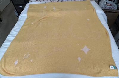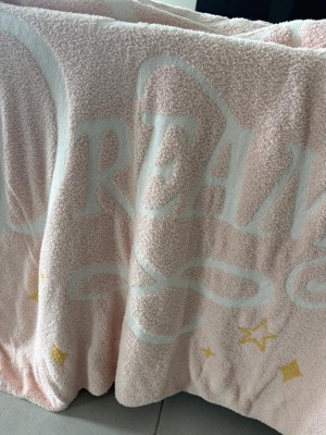 This is a cute, very soft, light pink knit on outside and yellow color on the inside throw blanket for children. This Disney pillowfort blanket has the inspirational saying Follow Your Dreams on it. The size of it is 48 inches x 58 inches and is made from 100% recycled polyester material.