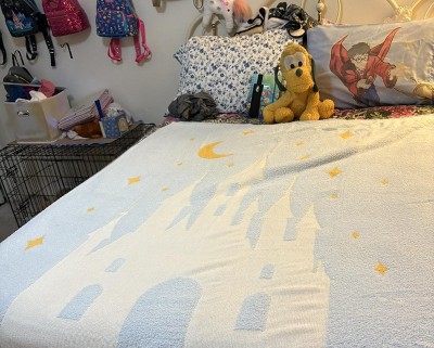A: The blanket showcases a white castle silhouette with gold stars and a moon on a light blue background.
