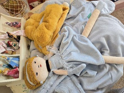 This is a cute princess blanket for little children. It fits my 8 year old, but would probably fit better on a 5-6 year old. It’s a beautiful blue color, and the hair (the hood part that goes over their head) is a pretty yellow like Cinderella. There are even fake pearl earrings, which is completely adorable. Very soft and good quality.