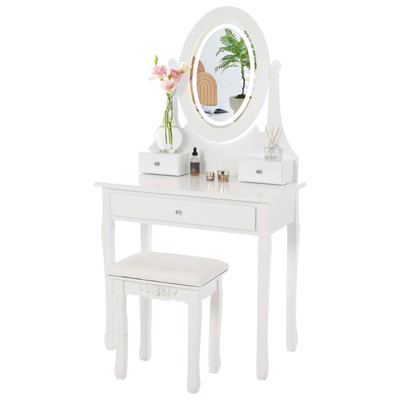 - Complete Set: This girls' vanity set includes a desk, stool, and wooden makeup playset. It features a mirror with light for makeup application, 2 tabletop storage grids, and 1 spacious drawer to store accessories.