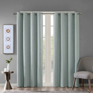 Energy efficiency meets chic casual style, with our SunSmart Maya Printed Heathered Blackout Panel. Featuring a printed heathered design in a soft dusty seafoam hue, this blackout window panel is made from a textured polyester slub base fabric creating beautiful texture and dimension. A one pass foamback finish with additional bonding is added and enhances the panel to buffer most sunlight, while also creating a significant barrier to reduce outside noise. The silver grommet top makes it easy to hang, open, and close the window panel throughout the day; fits up to a 1.25¡± diameter rod. Perfect for home offices, family rooms, and bedrooms - this blackout panel provides considerable energy savings and a high-level of privacy by bringing a heavily shaded lighting level to any room.