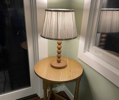Love it! I bought this in store because it caught my eye and I love a good stripe. Surprised at the great price too. Set it up and it’s perfect, along with the wood base I ordered online from Target. Came here to write a review and saw the online photo. Got a good chuckle because it is NOT the same shade. They changed the production run after styling and photographing the prototype I’m sure. And funny thing is if I had seen the online version I wouldn’t have wanted it. Love the darker green and more bell shape than the ads. 💛