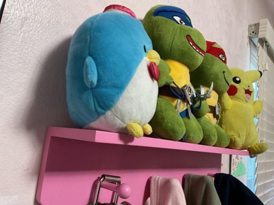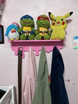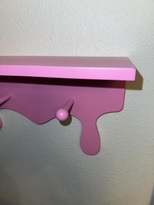 Attempting to find the perfect spot for this fun shelf! The pink is very vibrant, it’s giving Pepto-Bismol. It’s drippy along the bottom of the shelf, making it look like slime or paint drips, which is just a great addition to a kid’s room. Flat on top for knickknacks and then the hanging hooks for practicality. Fun addition to any room actually!