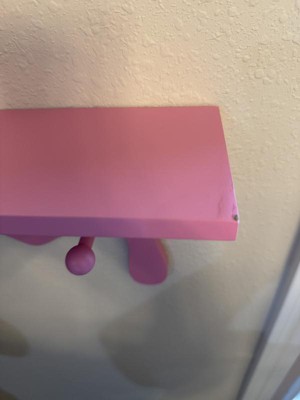 This pink drippy shelf is such a fun idea. It adds fun to any room. It is a beautiful shade of pink. The pegs are a great addition for added storage. It was very easy to install and was even provided wall anchors. Unfortunately my drippy shelf arrived damaged on the corner.