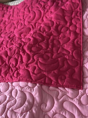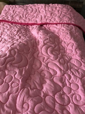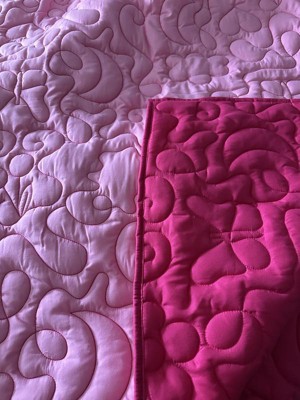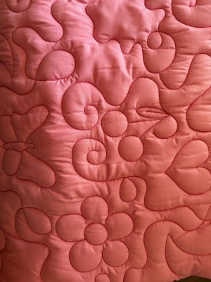 This is the prettiest quilt. One side is a lighter pink and the other side is a darker pink. It has so many shapes stitched in it that you can see from either side. There are flowers, butterflies, cherries, hearts, moons, and clouds. It is lightweight and so soft! You can definitely reverse it if you want to switch up the color. The pink shams have a gray border on them that gives them a scalloped look. This really is the cutest comforter for any girls room!
