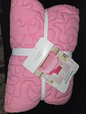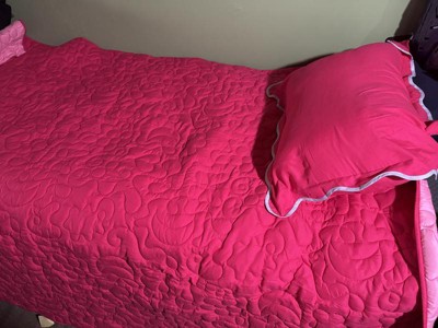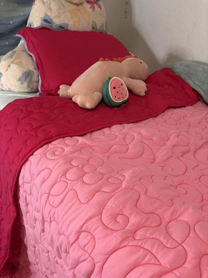 This reversible quilt is lightweight and the stitching is very well done. It’s hot pink on one side and light pink on the other. The stitching is in a number of pattern such as cherries, flowers, stars, moon, and hearts. I think the lighthearted theme of the quilt is more suitable to a younger child rather than an older teen however, with that said my middle aged teen absolutely loves the quilt and thinks it’s perfect for summer just light enough to provide weight as a quilt without being too heavy in the Spring and summer night heat. The matching pillowcase in a hot pink shade is nice and gives a cloud appearance to the bed set assembly