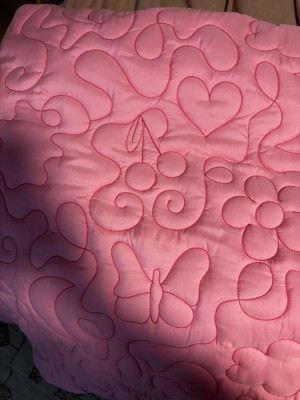 We love this comforter! The color is so bright and fun! The design is so cute and fun too! There are butterflies and hearts and it is every little girls dream! The size of the comforter is perfect too and fits just right on the bed. We love that it is reversible too! One side is a bright pink and the other is a darker pinkish red. I highly recommend this comforter!