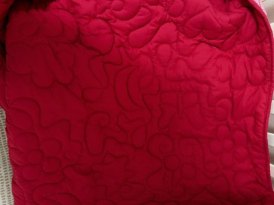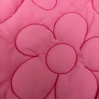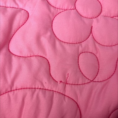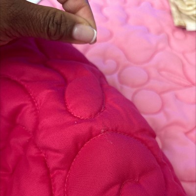 It’s a very lovely stitched quilt with beautiful flowers and butterfly patterns. The matching pillow case is beautiful with nice border. I found the shade of pink on lil brighter side and may be it is to give the contrast on the two sides. I would have loved this quilt more if the shade of pink was few tone lighter
