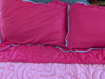 This comforter set is really, really cute. It fits perfectly on a queen sized bed, the quilt is reversible, and the stitching thread matches the dark pink, so it shows up in contrast on the light pink side. The shams fit a standard pillow. The quilt is really lightweight, which is good as it's moving into the summer months here.