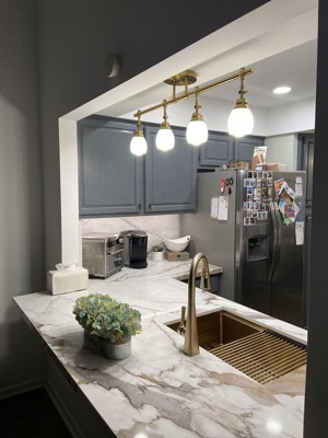 I needed a beautiful fixture to go over my newly renovated kitchen sink, and had difficulty finding one that had several lights, but wasn't very tall. I found this beauty at Lamps Plus, and it is just perfect! Looks great with my new countertop, kitchen sink, and faucet. I am very pleased with the result!