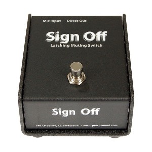 The ProCo Sign Off is a latching mic-mute footswitch. Step on the switch to turn mic off. Step again to turn the mic back on. It is positioned inline between the mic and the board (plug mic into Sign Off; plug Sign Off into sound system). Especially handy for singing drummers and others who require a latching switch. It's switchable for use with condenser or dynamic mics.