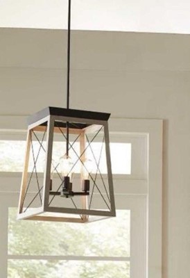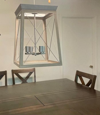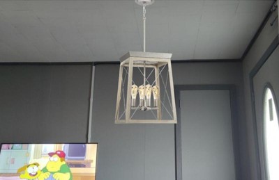 [This review was collected as part of a promotion.] This fixture came wrapped up well, but boy was it HUGE. It installs like a ceiling fan, and it was easy to hang. It comes with rods to secure the light fixture. We did not end up using all of the rods as our ceiling was only 9 feet tall. This would work well with a farmhouse theme as it has a colored galvanized look with a cross cross rectangle pattern. As we could not install the fixture in the center of the room, we installed it just inside the front door in the corner of our living room. I recommend looking at multiple lightbulbs as the lights are in a criss-cross pattern and we had originally thought we would need narrow and tall lightbulbs in order to fit side by side. This would also look good with globe shaped lightbulbs. It would be quite a bit of work to dust this fixture had we hung this on a more appropriate 12-14 foot ceiling as the cage is not smooth and the corners can trap dust easily. Overall, the light is cute but little things for us give it a bit less than 5 stars.