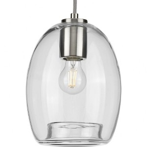 Introducing the Caisson Collection Mini-Pendant from Progress Lighting. Infuse your home with subtle industrial flair with this stunning piece. Inspired by suspension bridges, the brushed nickel steel base and smooth round ceiling plate create a modern look. The clear glass shade with a rolled rim adds an artisan touch. With a width of 7.88", height of 10.88", and length of 7.88", this dry-rated mini-pendant requires assembly and includes a 4.88" canopy. The incandescent light with 60 watts of power creates a warm and inviting atmosphere. Illuminate your space with this stylish and functional addition to your home.