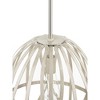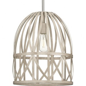 Introducing the Chastain Collection from Progress Lighting, featuring a stunning 1-light pendant made of durable steel with a bleached oak distressed faux wood finish. The airy frame draws inspiration from the artistry of basket-weaving, creating a graceful silhouette that adds an eye-catching touch to any home decor. The brushed nickel stem enhances the artisanal style, while the 14" width, 17.25" height, and 14" length make it a perfect statement piece. With a chain length of 8" and a dry rating for moisture, this pendant is suitable for various spaces. Lamping type is incandescent, with a 60-watt capacity. Elevate your space with the Chastain pendant light.