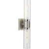 Introducing the Clarion Collection 2-Light Polished Chrome Steel Bath Vanity Light by Progress Lighting. Embrace minimalist simplicity with this modern fixture, featuring a sleek square backplate and rounded light base finished in polished chrome. The cylindrical glass shades emit a crisp, clean glow, creating a contemporary aesthetic. This damp-rated fixture is 20.37" in length, 4.25" in width, and 5" in height, with a backplate measuring 5" in width and length. The 2 incandescent bulbs with a wattage of 60 watts each provide ample illumination. Mounting direction can be adjusted up or down, and the shades are included, measuring 2.75" x 2.75" x 8.87". Elevate your bathroom with the Clarion Collection's modern elegance.