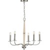 Introducing the Durrell Collection Chandelier by Progress Lighting. Crafted from durable steel with a sleek matte black finish, this chandelier boasts a width of 26.5", height of 22.5", and a length of 26.5". The 72" chain allows for customizable hanging, while the wooden column coated in a cerused white finish adds a touch of elegance. With a dry rating, this chandelier is suitable for various settings. The vintage candlestick-inspired light bases, finished in brushed nickel, exude a timeless charm. This fixture requires assembly and includes a 5" canopy. With a 60W incandescent lamping type and the capacity for 5 bulbs, this chandelier provides generous illumination for any space.
