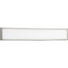 Introducing the Everlume 1-Light Brushed Nickel 32-Inch Frosted Glass LED Modern Bath Vanity Light by Progress Lighting. Crafted from durable aluminum with a sleek satin white finish, this fixture measures 1.38" in width, 5" in height, and 32.01" in length. It features a backplate width of 17.72" and a backplate length of 0.78". The LED light source offers 32 watts of power, with a high CRI of 90 and a warm 3000 Kelvin color temperature, producing 2808 lumens of even, glare-free illumination. This damp-rated fixture is suitable for bathroom use and can be mounted in an up or down direction. The frosted polycarbonate diffuser shade ensures uniform light distribution, making it an ideal choice for modern bath spaces. With its clean lines and versatile design, the Everlume vanity light is a stylish and functional addition to any contemporary bathroom.
