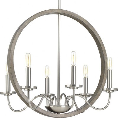 Progress Lighting Galloway 4-Light Foyer Pendant, Brushed Nickel, Open Frame, Grey Washed Oak, Candelabra Bulbs