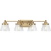 Introducing the Hinton Collection from Progress Lighting, a stunning addition to your home. Crafted from durable steel with a vintage brass finish, this 4-light brushed nickel bath vanity exudes timeless elegance. The fixture measures 7.12" in width, 7.75" in height, and 33.5" in length, with a 5.12" height from the outlet box. The backplate is 8" in width and 5" in length. Each light features incandescent bulbs with a wattage of 60 watts, providing a warm and inviting glow. The clear seeded glass shades add visual texture, creating a captivating ambiance. With a damp rating, this fixture is suitable for use in bathrooms and other moisture-prone areas. Embrace stylish simplicity and elevate your space with the Hinton Collection from Progress Lighting.